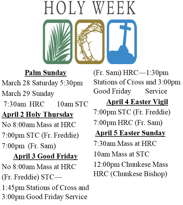 1:30pm Good Friday Mass 1:30pm at HRC (Fr. Sam)